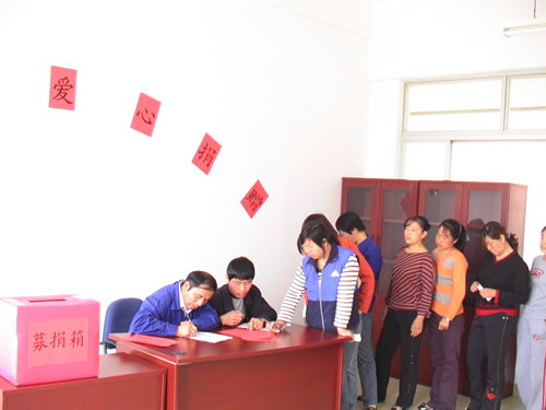 开展爱心捐款活动的号召,组织了包括基建后勤处、保卫处和财务处在内的三个处室的入党积极分子联合募捐。 5月15日上午,三个处室的入党积极分子,包括行政人员、下属的工作人员(包括保安员、保洁员、楼管员、维修人员、食堂员工、图书馆劳务人员)和食堂、商铺经营者在党员的带动下积极参与,以实际行动支援灾区同胞。