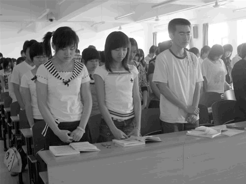14时,全院教职员工及无课班级准时集结在体育场。14时20分,校园广播鸣响,全体人员表情肃穆、神态庄重。14时28分整,警报鸣响,全院师生默哀三分钟。