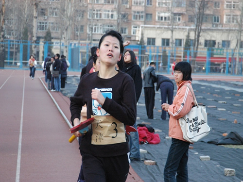 4:30分,比赛正式开始,根据赛制安排,由各p站 主管学生工作的老师领跑前50米,之后将接力棒传给各院参赛队员。前四棒为女生,围绕操场跑两圈,完成800米赛程,后六棒为男生,围绕操场三圈,完成1200米赛程。