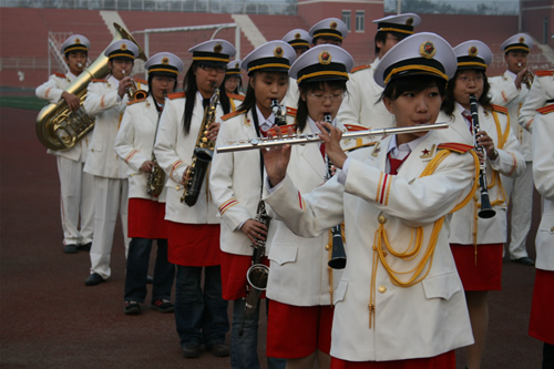 操场,“奏国歌,升国旗,向国旗敬礼”随着一声令下,学生艺术团管乐团演奏《义勇军进行曲》,在雄壮的国歌演奏声中,鲜艳的五星红旗在数千名师生的注目礼中冉冉升起。