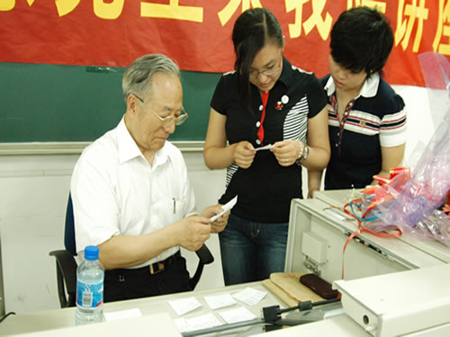 张镜源先生仔细阅读同学们提问的小纸条,悉心与同学交流。