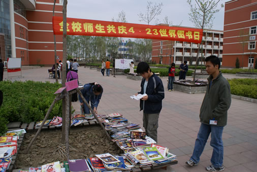4月21日,敷天图书协会在图书馆前举行书籍大展卖活动。此次展卖的书籍主要有学习教材、参考书目、文学读物、名著小说、过期杂志等。