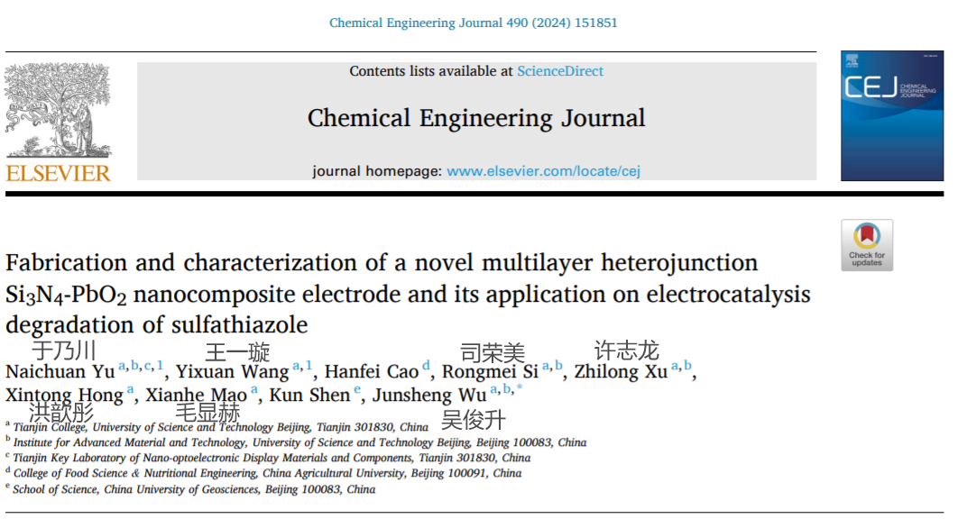 近日,p站 材料与环境p站 科研成果“Fabrication and characterization of a novel multilayer heterojunction Si3N4-PbO2 nanocomposite electrode and its application on electrocatalysis degradation of sulfathiazole(新型多层异质结结构Si3N4-PbO2电极的制备、表征及其电催化降解磺胺噻唑的应用)”在化工材料领域国际顶级期刊Chemical Engineering Journal(中科院一区期刊,影响因子15.1)上发表。材料系于乃川老师为论文第一作者,作者中还包括两名参与项目的本科生(洪歆彤、毛显赫)。该论文是在p站 院长基金项目支持(项目编号No.2023YZJJ-KJ06)下产出的典型成果,也是p站 首次以第一单位发表影响因子大于10.0的学术论文。