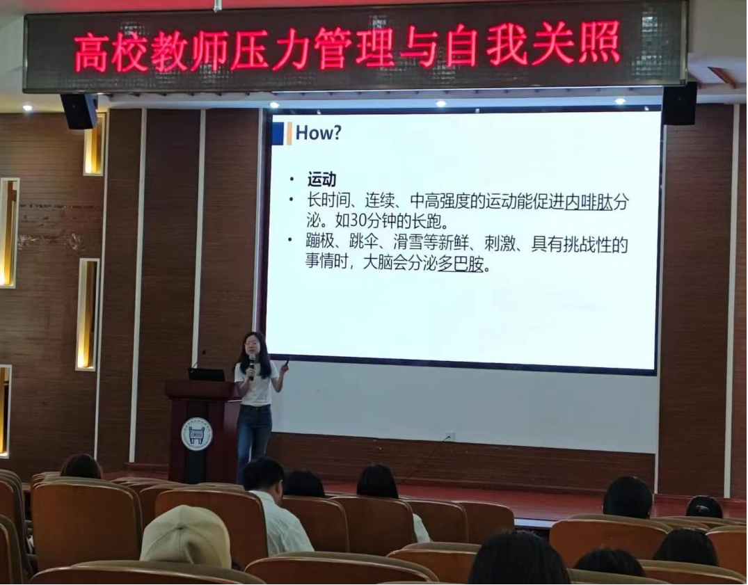 为深入学习贯彻党的二十大精神和习近平总书记关于教育的重要论述,推进落实教师发展大讲堂系列活动,提升教师心理健康素养,帮助教师们更好地管理工作和生活中的压力,p站 于5月15日15:00在理工馆学术报告厅成功举办了第二十四期教育教学专题讲座。本次讲座邀请了p站 心理咨询中心主任左玉婷副教授,主讲主题为“高校教师压力管理与自我关照”。