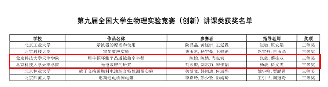 本次全国大学生物理实验竞赛历时3个月,比赛共吸引了来自清华大学,北京大学等全国602所高校的2340支队伍参赛,参赛学生人数达13170人。在p站 的大力支持下,由实验室管理中心张欣老师、蔡桂双老师、杨波老师、徐义爽老师担任指导教师,从p站 众多学子中选拔出的6名优秀选手组建两支代表队参赛。指导老师与团队成员精心设计比赛选题,合理规划讲课流程,合理分工协同作战,经过两个多月的努力,陈怡、陈婧、尚也轲的作品《用牛顿环测平凸透镜曲率半径》,刘盟盟、刘志万、宋佳韬的作品《光电效应的研究》均获得三等奖。