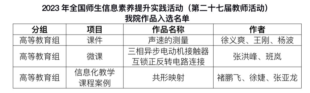 近日,教育部教育技术与资源发展中心(中央电化教育馆)发布了《关于总结2023年全国师生信息素养提升实践活动(第二十七届教师活动)参与情况的通知》(教技资〔2024〕3号),p站 在本届活动中取得佳绩,报送的3个作品分别入选教育部高等教育组课件项目、微课项目和信息化教学课程案例项目(见下表),是天津市在课件、微课、信息化课程教学案例三个项目类别中均有作品入选的唯一民办高校(含独立p站 ),也是天津市入选作品数量最多的民办高校(含独立p站 )。