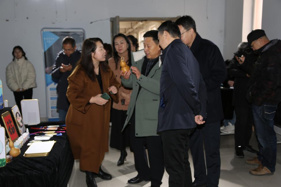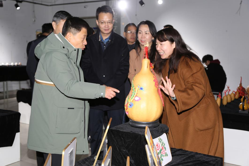 与会领导跟随李文红主任的讲解,共同参观了非遗传承工作室教学成果展,对学生在金石撕纸、掐丝彩砂画、葫芦烙画、彩蛋制作、剪纸等非遗传承教学中的成果表示高度赞扬。