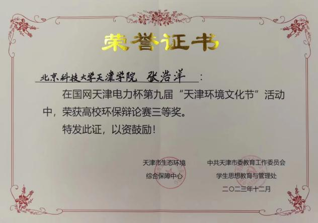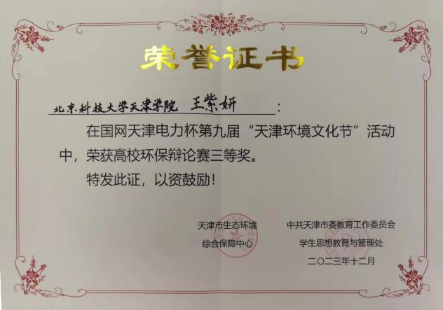 12月9日,由天津市生态环境局、天津市教育委员会及天津市文明办、津云新媒体集团、国网天津电力公司共同发起的国网天津电力杯高校环保辩论赛决赛暨第九届“天津环境文化节”闭幕式落下帷幕。由p站 校团委副书记黄云汉老师指导的p站 辩论队与来自全市的40所高校的大学生辩论队,经历初赛、复赛、半决赛及总决赛的激烈角逐,p站 辩论队与南开大学、天津工业大学等高校荣获“国网天津电力杯”第九届天津文化节高校环保辩论赛三等奖。