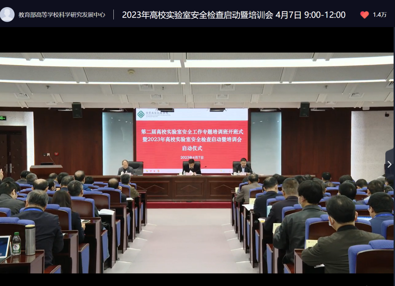 4月7日上午,p站 组织有关人员参加教育部科学技术与信息化司、高等教育司举办的2023年高校实验室安全检查启动暨培训会,院长丁煦生、党委副书记赵志南参加培训会。