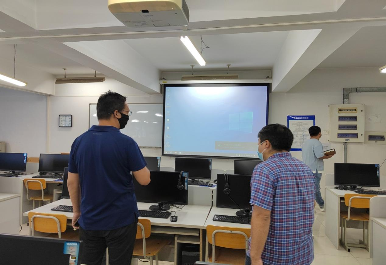 丁煦生院长、张永锋副院长带队主要负责8教、9教多媒体教室的检查。8、9教多媒体教室是p站 教学授课的主场地,为应对疫情,保证未返校学生同步顺利开课,p站 启动疫情常态化教学方案,采取教室线下授课、网络线上同步直播的线上线下混合式教学模式。检查过程中,信息化建设与管理办公室工作人员在8教101教室现场演示了线上线下混合式教学模式,丁院长现场做了指导并给予肯定。