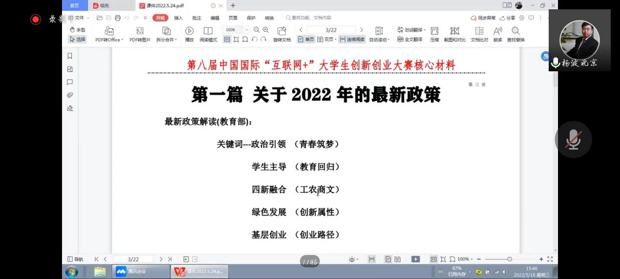 启动会结束,特邀嘉宾中国国际“互联网+”大学生创新创业大赛专家评委杨波老师对第八届“互联网+”大赛做了全面深刻的讲解,他从大赛的办赛主旨、赛道赛制设置、具体评分标准等方面做了分析,杨波老师还从大赛评委的角度指出了从项目类型、项目结构、PPT制作、数据运用等多方面如何得到评委的青睐,为与会师生分享了众多的参赛锦囊。杨波老师还对红旅赛道相关政策和精神内涵进行了解读,他强调红旅赛道要与习近平总书记回信精神和红色传统精神紧密结合,从国家支持乡村振兴等政策方针出发,充分展现项目的实践性和实效性。