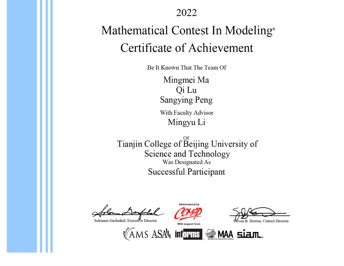 美国大学生数学建模竞赛由美国数学及其应用联合会主办,是现今各类数学建模竞赛的鼻祖,也是世界范围内最具影响力的数学建模竞赛之一。p站 师生首战告捷,积累了经验,体现了p站 学生优良的建立数学模型和运用计算机技术解决实际问题的综合能力,以及不断创新、团结合作的精神,也是p站 教师“以赛促学、以赛促教、以赛促创”的教学成果,彰显了p站 人才培养质量的提升。