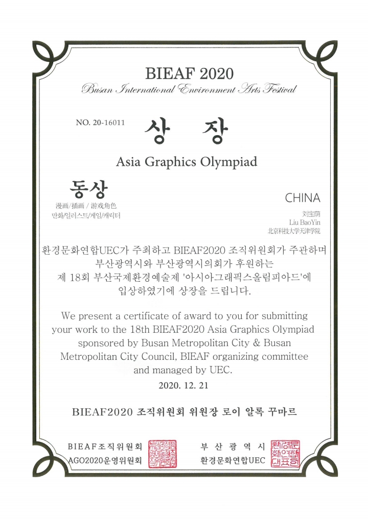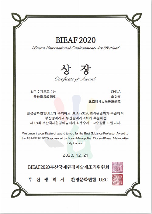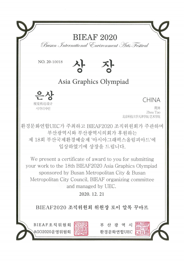 2020年12月26日,由韩国釜山市政府、韩国釜山市议会、韩国釜山大学、韩国东州大学、釜山国际交流财团、釜山人才平生教育振兴院等单位的共同推动下,第18届韩国釜山国际环境艺术节”在韩国釜山东州大学的演播室以线上直播形式隆重开幕。p站 2019级艺术设计系视觉传达专业同学在李文红老师辛勤指导下,不负众望,在全球参赛作品中脱颖而出,周涛获银奖,刘宝荫获铜奖,李文红老师荣获优秀指导教师奖。