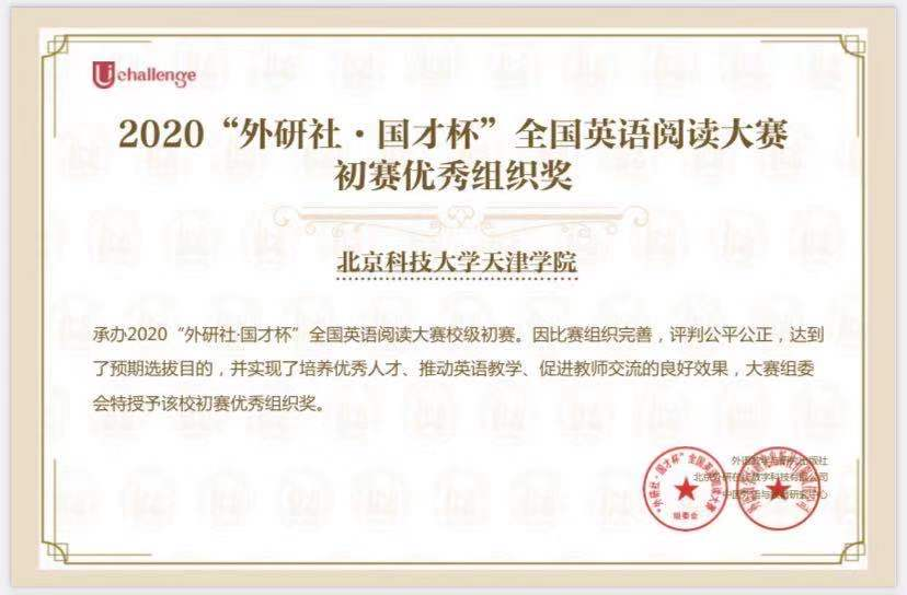2020年10月起,p站 开展2020“外研社•国才杯”全国英语阅读、写作、演讲大赛组织工作,并成功承办校内初赛。被评为天津市第二十三届大学生英语演讲竞赛组织工作“先进单位”荣誉称号和阅读、写作、演讲三项大赛初赛优秀组织奖;外国语p站 分团委书记李萌获得2020“外研社·国才杯”全国英语阅读、写作、演讲三项比赛的“优秀管理员奖”;教师张晓宇、张佳康荣获天津市省级复赛“指导优秀奖”;学生万海利、古锡蓉、董美含分别荣获全国英语阅读、写作、演讲省级复赛(天津赛区)优秀奖。