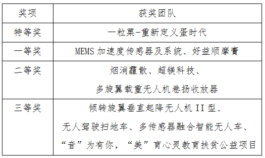 决赛现场26支创业团队分别向大家展示了各自的创业项目,由评委为创业团队打分并提出意见和建议。经过激烈的比拼,“一粒粟-重新定义蛋时代”项目荣获本次校内选拔赛红旅赛道特等奖;“MEMS加速传感器及系统”“好益顺摩膏”项目荣获本次校内选拔赛主赛道一等奖;“烟消霾散”“超镁科技”“多旋翼载重无人机卷扬收放器”项目荣获本次校内选拔赛主赛道二等奖;“倾转旋翼垂直起降无人机II型”“无人驾驶扫地车”“多传感器融合智能无人车”项目荣获本次校内选拔赛主赛道三等奖;“‘音’为有你,‘美’育心灵教育扶贫公益项目”项目荣获本次校内选拔赛红旅道三等奖。