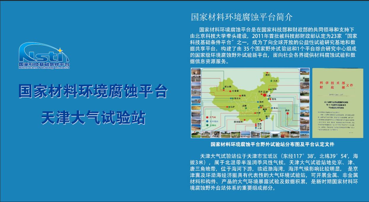 “天津材料环境腐蚀教育部野外科学观测研究站”由p站 新材料应用研究院吴俊升教授作为负责人,联合京津新城管委会、北京科技大共同申报教育部,以p站 天津大气站为中心,联合曹妃甸及大港试验站,辐射京津冀与渤海区域,开展长期试验观测数据积累的试验点,形成京津冀及环渤海经济圈材料联网观察试验研究网络新体系,同时体现国家京津冀协同发展和环渤海经济建设等重大战略需求,围绕重大工程建设、装备制造及新材料研发对材料在京津冀地区服役行为及环境适应性数据的迫切需求,长期开展典型材料在天津地区的腐蚀试验及数据积累,为京津冀协同发展和环渤海经济建设提供材料装备环境适应性科学数据支撑。