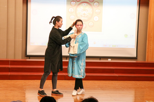 讲座现场,化妆师为四位同学进行了京剧妆容的设计,高航老师以此向大家讲解京剧中各种脸谱的含义,同时带领同学们学习京剧的基础动作及唱腔。高航老师希望我们能够用京剧讲述正能量的中国故事,引发全场共鸣。讲座最后,高航老师8岁的学生为大家演唱的京剧片段获得阵阵掌声。